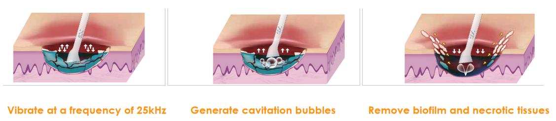 Reducing ultrasound power and contact force may decrease pain but can compromise debridement effectiveness.